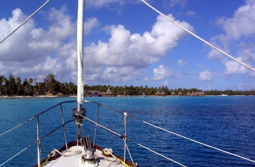 Anchored off the Kia Ora resort hotel in the lovely Rangiroa lagoon